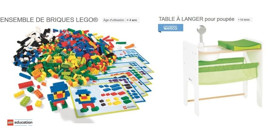 Sélection coup de coeur de kidiklik ; parmi les cadeaux d'éveil pour les tout-petits ; on craque pour l'animal douillet "simon le mouton" ref 50417, dès la naissance, 54€ - idéal pour les grandes séances de calins. Parmi les cadeaux de motricité fine pour les 0-3 ans on aime le Jeu d'Equilibre Flamant Rose "zigolos" ref 55 432, dès 3 ans, 19,90€, et "ma première boîte à serrures" ref 53 291, + 3 ans, 49,90€. Pour les petits bâtisseurs en herbe l'ensemble de briques LEGO 1000 pièces avec ses fiches modèles ref 54 345, dès 4 ans, 59,90€. Pour jouer au papa et à la maman ou faire comme la nourrice, quoi de mieux qu'un meuble à langer pour poupée, ref 53 483, + 12 mois, 132,50€ ou une "dînette eco-responsable", ref 50 937, + 18 mois, 34,90€. Pour les petits bricoleurs, on craque pour le bel établi en bois, ref 32 963, + 3 ans, 77,50€. Pour aider votre enfant à éveiller ses sens, à parler de ses émotions, vous aimerez ce memory en bois des émotions, ref 55 576, + 2 ans, 26,90€. Côté jeux de société on est intrigué par le jeu "cache noisette", ref 55 515, + 6 ans, 14,90€ qui se joue seul. Pour les enfants qui aiment être dehors et bouger, le "KART Spider" c'est le top du top, ref 53 972, + 5 ans, 245,00€.