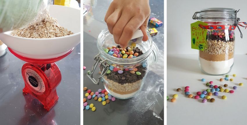 Nous vous proposons cette recette de cookies avec des ingrédients qui tiennent dans un bocal d'un litre et qui forment de jolies strates. Vous pouvez également les mettre dans une jolie bouteille (avec un large goulot).