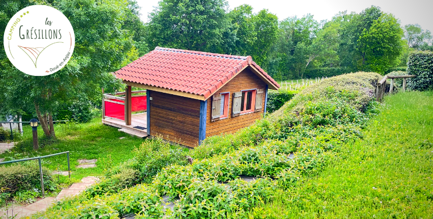 Ici, pas d'hébergements insolites mais de jolies maisonnettes en bois, colorées, situées sur un espace en escalier, ce qui offre à chaque hébergement une vue magnifique sur la vallée du Layon. Sans sanitaire, chaque maisonnette offre tout de même tout le confort nécessaire à la famille : lits, cuisine, point d'eau mais aussi terrasse individuelle. Au camping des Grésillons, les familles viennent trouver l'esprit "camping, petit village" où tout le monde sociabilise, tout en ayant le confort de la maison et son indépendance.
