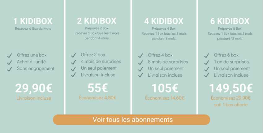 En choisissant parmi les différentes formules d'abonnement (de 2 à 6 box, pour 4 à 12 mois d'abonnement), vous ne payez qu'une fois et faites parvenir le nombre de box souhaité directement au domicile de l'enfant, sans avoir besoin de recommander lorsque les nouvelles sont mises en vente !