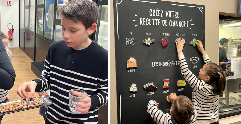 Puis, nos kidi-reporters découvrent avec joie et intérêt les différentes étapes de la fabrication du chocolat. À travers les vitres mais aussi au cœur de l’atelier, ils peuvent admirer les différentes machines ainsi que artisans chocolatiers en plein travail. La visite est ponctuée de plusieurs moments de dégustation : si l'amertume du grué de cacao ne rencontre pas un franc succès, la dégustation du praliné leur redonne rapidement le sourire !