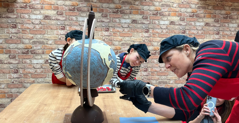 Première mission pour nos apprentis reporters - skippers - chocolatiers : peindre les mers et les océans avec du chocolat liquide coloré en bleu. Tout à leurs pinceaux, nos kidi-reporters redoublent d'attention et de précision pour remplir leur tâche (presque comme quand ils font leurs devoirs voyons ...). Attention toutefois à ne pas (trop) dépasser car Sam a l’œil sur les détails.