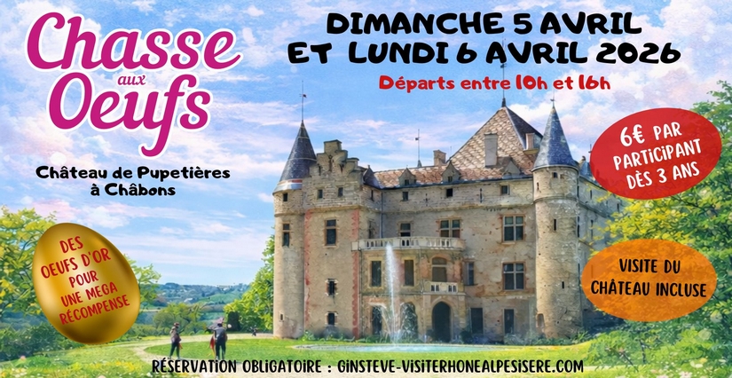 Au Château de Pupetières, la chasse aux œufs de Pâques se transforme en véritable jeu de piste dans le parc : les enfants observent, cherchent et identifient les œufs cachés… avec peut-être l’Œuf d’Or à la clé ! Trois niveaux de difficulté permettent à chaque âge de profiter de l’aventure en famille.