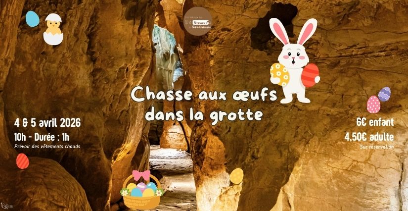 Partez en famille à la chasse aux œufs aux Grottes de Saint-Christophe : explorez la grotte et ses recoins à la recherche des œufs cachés, avec une délicieuse récompense à la clé ! Une aventure souterraine ludique et gourmande pour petits et grands !