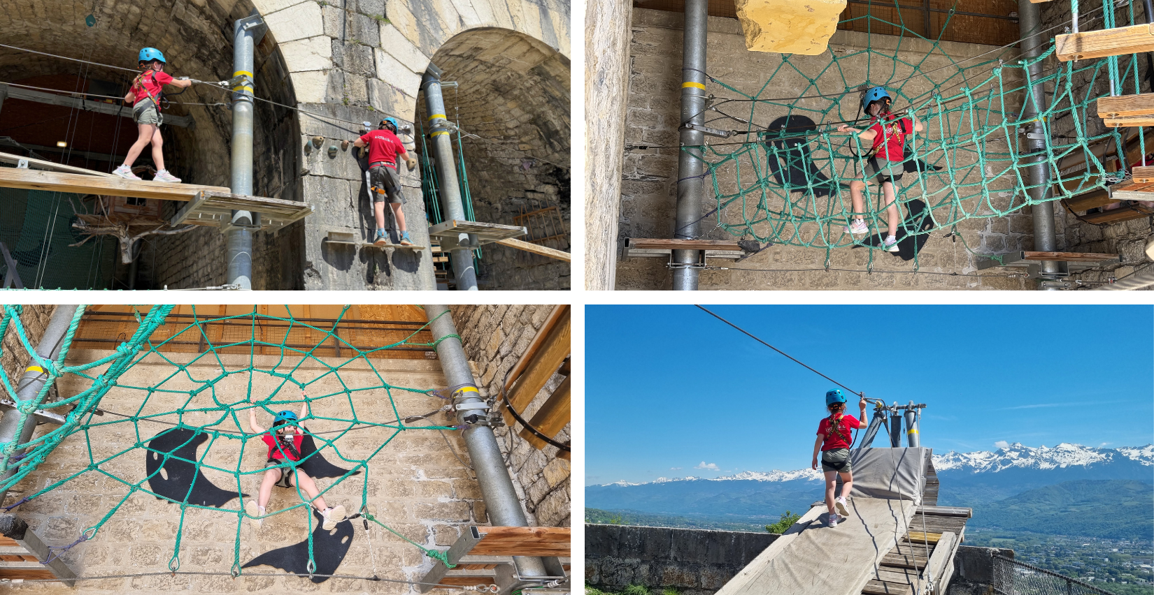 Place ensuite à l’extérieur avec le parcours accrobranche dans un cadre urbain unique ! On équipe les enfants et les règles de sécurité leur sont expliquées. Les parcours sont adaptés à chaque âge : les 3-5 ans évoluent près du sol, tandis que les 6-11 ans prennent de la hauteur. Et le clou de l'activité ? La tyrolienne face aux montagnes. C'est une pépite !