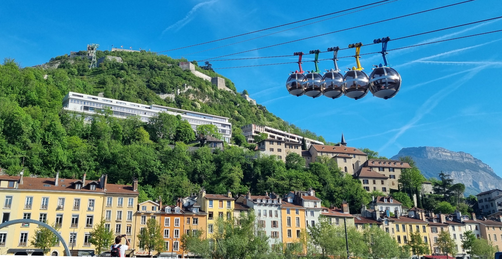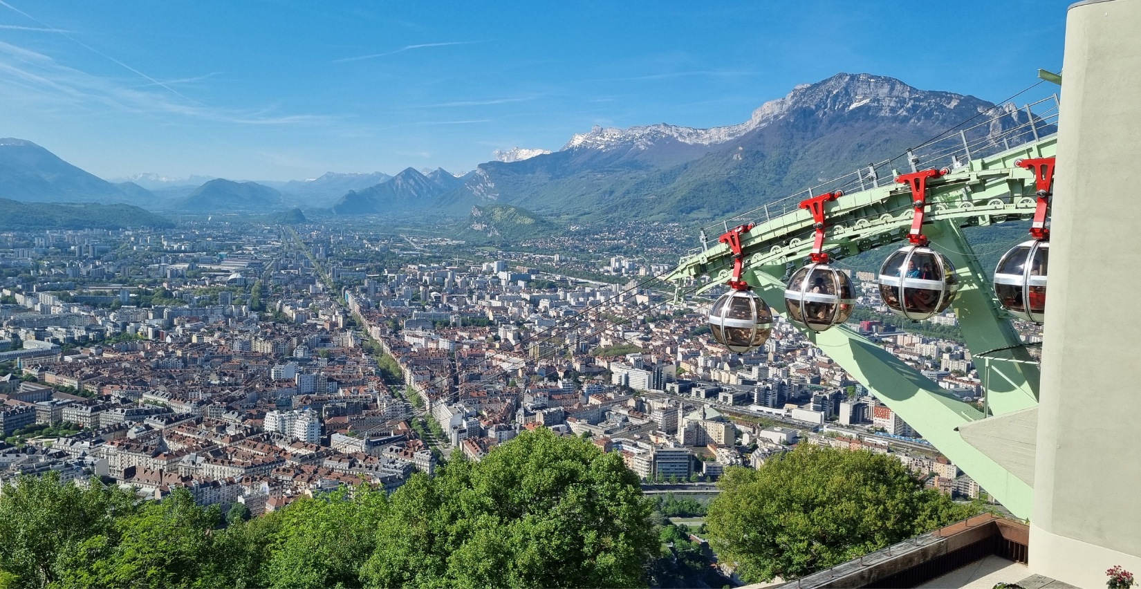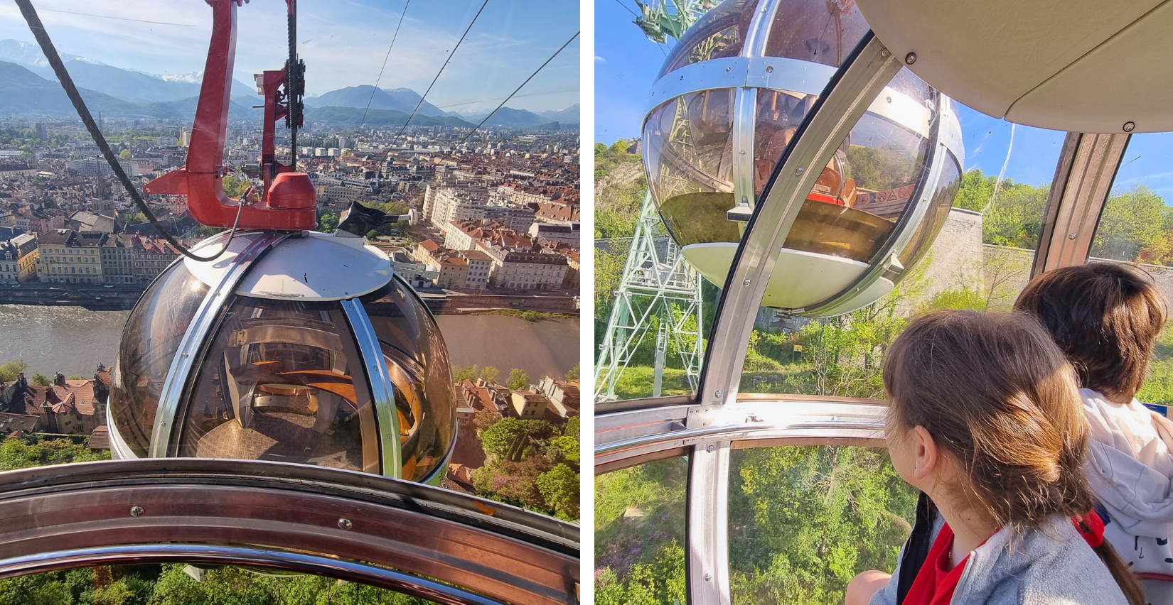 Et c’est parti pour une montée express de 5 à 6 minutes pour relier le centre-ville au sommet de la Bastille, mais riche en sensations ! Très vite, Grenoble s’étend sous nos pieds, avec vue sur la ville, le fleuve Isère et les montagnes. Et finalement, maman n'a même pas eu le temps d’avoir peur. Le trajet est court, mais suffisant pour en prendre plein les yeux. Et un petit coucou aux bulles qui redescendent !
